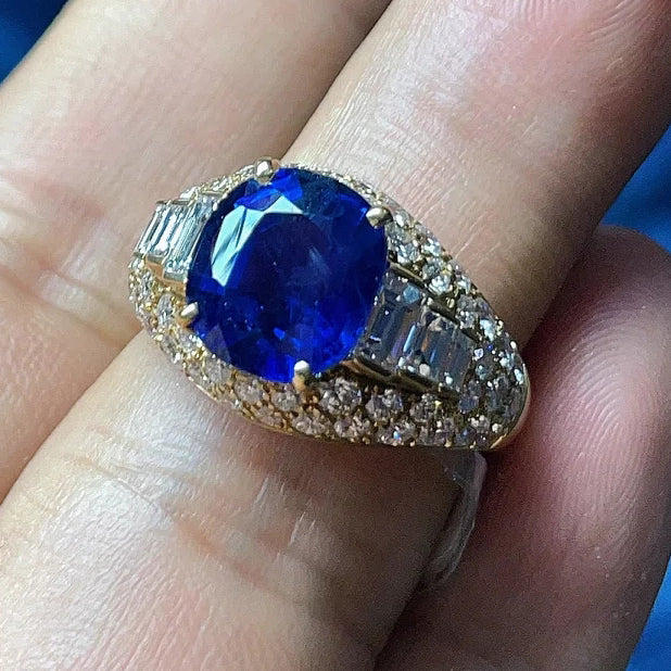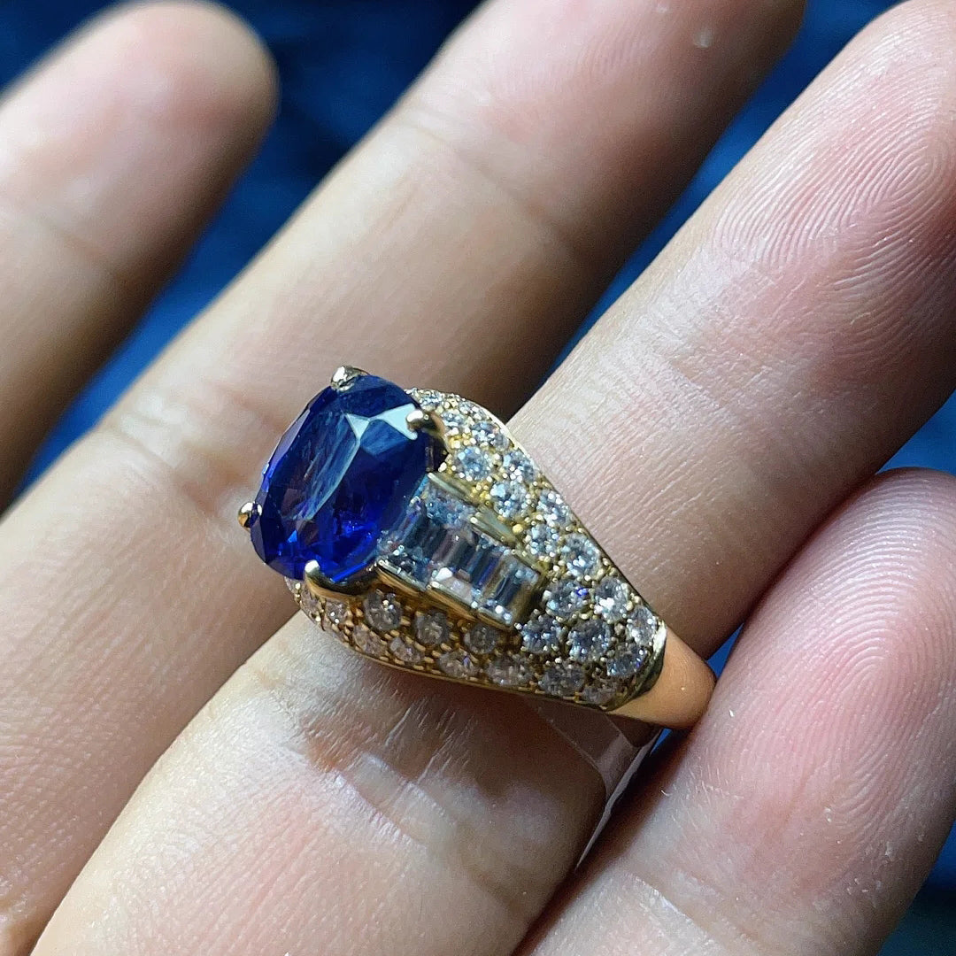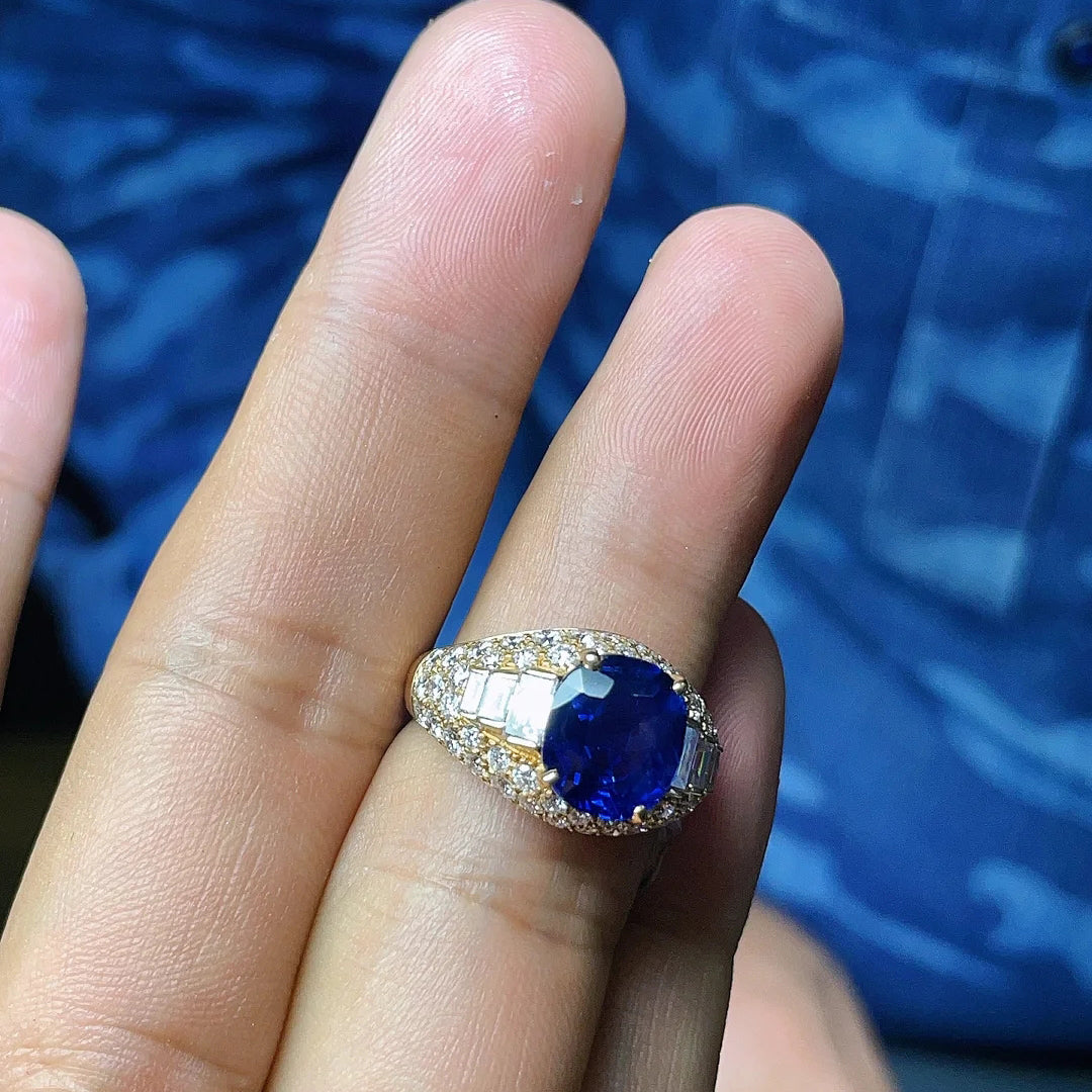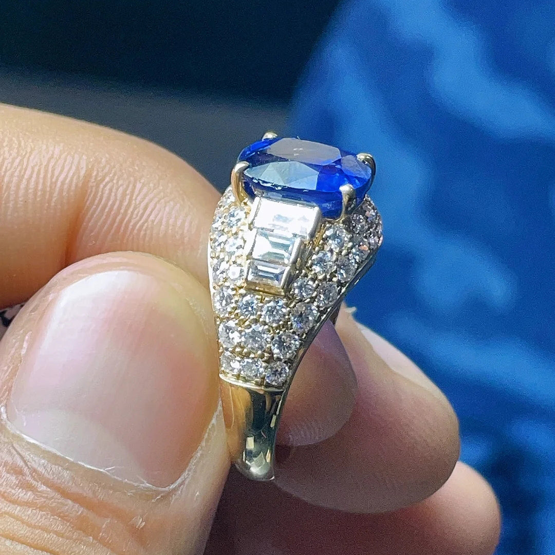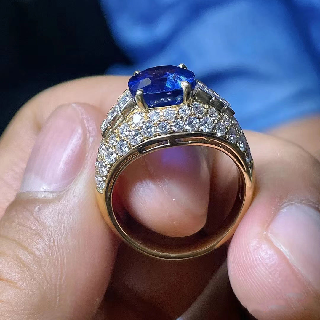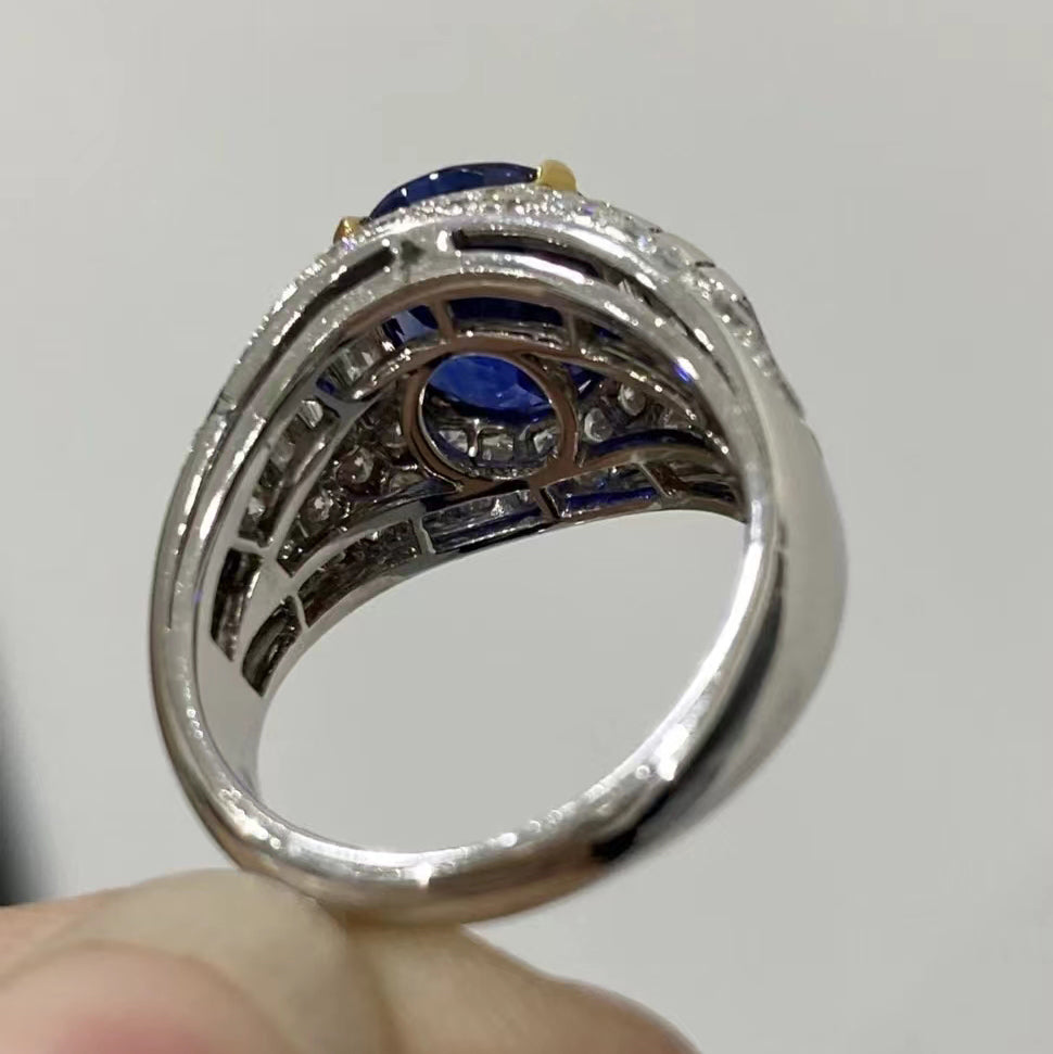 BGL四爪波面满钻镂空彩宝双肩梯方蓝宝石戒指