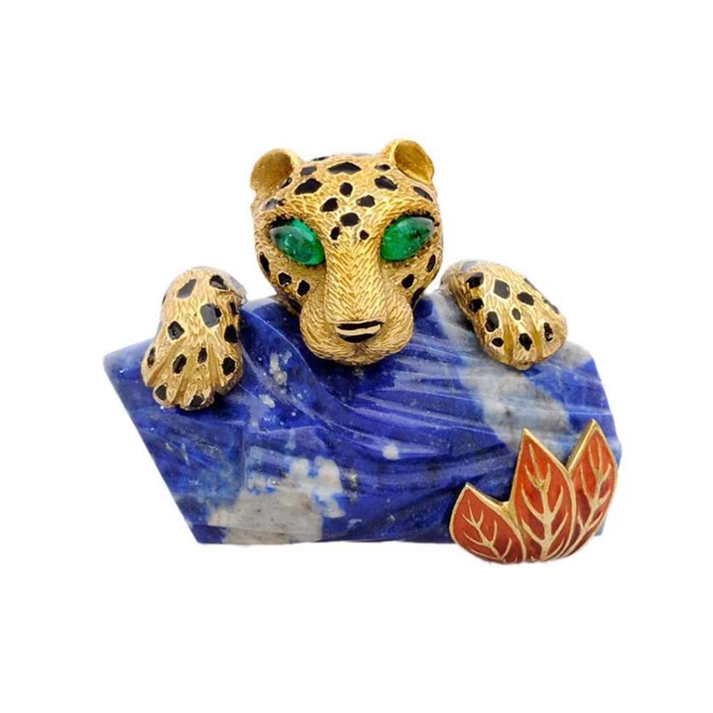 KDY-N1301367豹子双脚趴石头下面叶子胸针